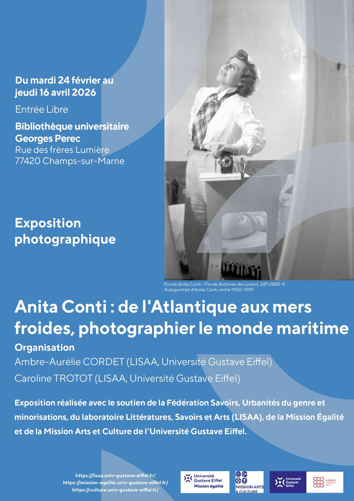 L'exposition rassemble un remarquable ensemble de photographies prises par Anita Conti (1899-1997) lors de ses missions scientifiques maritimes effectuées dans les années 1940-1950. En faisant dialoguer clichés pris à bord des pirogues et sur les côtes sénégalaises et clichés pris à bord des chalutiers-morutiers et au large des côtes de Terre-Neuve-et-Labrador et du Groenland, cette exposition permet d'appréhender le rôle éminent joué par Anita Conti dans la compréhension des écosystèmes marins et la gestion des ressources halieutiques. Ces photographies témoignent de la façon dont un regard sensible sur le monde maritime peut produire des savoirs essentiels aux enjeux de notre monde contemporain.